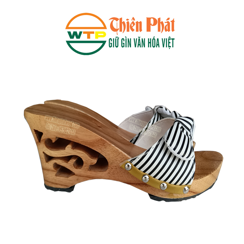 Sự đối lập giữa màu gỗ tự nhiên và họa tiết sọc hiện đại khiến đôi guốc trở nên nổi bật hơn, vừa giữ được nét mộc mạc của guốc gỗ, vừa mang phong cách thời trang nhẹ nhàng.